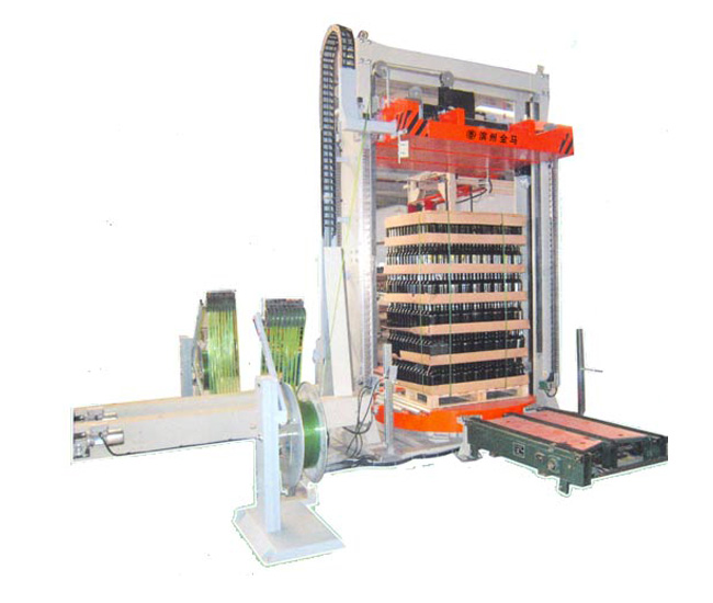 该设备安装于输送线中部,当捆扎机收到来自包装箱达到预定位置的信号时,打包头携外部的困扎带下降到包装箱顶部压缩到设定压力(最大压力2000kg),同时捆扎带向导通过包装箱底部,并受打包头电机牵引贯穿整周搭接、热合、切断、打包头升起,转盘旋转90度,重复以上动作,完成整个循环。